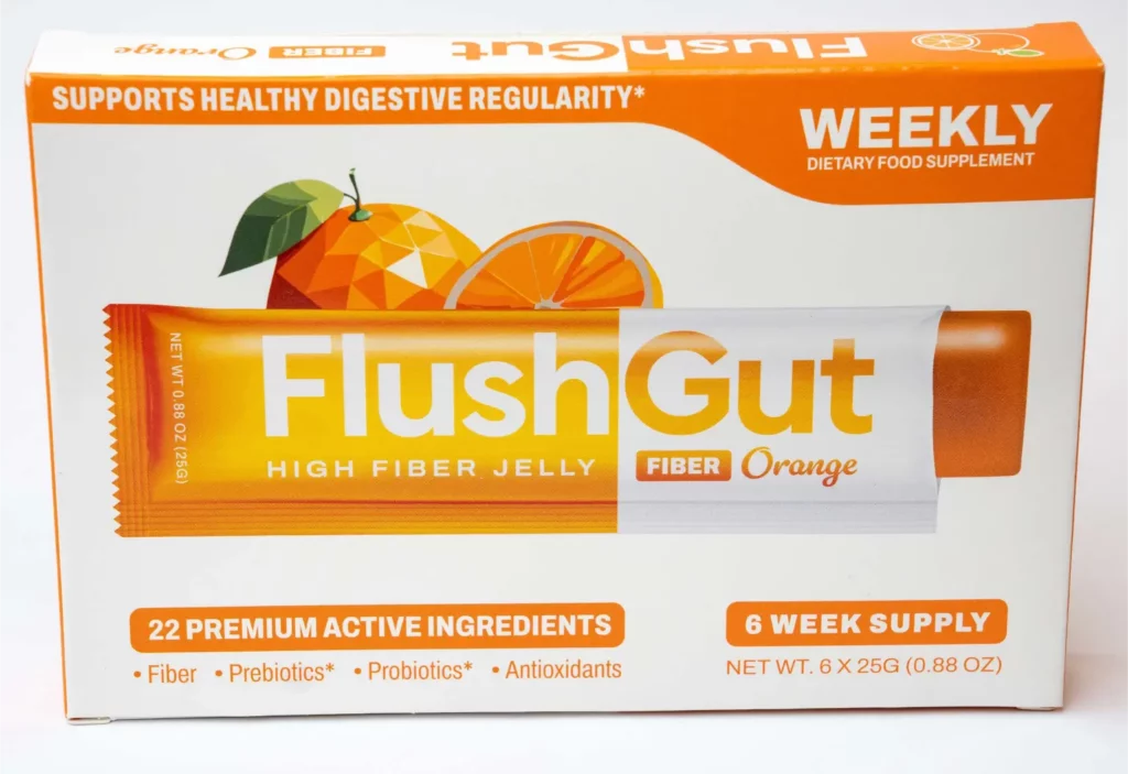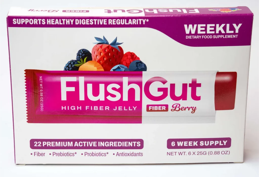 FlushGut is a WEEKLY fiber jelly dietary supplement designed to help you stay regular and support healthy bowel movements—so your bathroom routine feels more predictable, comfortable, and easy to stick with.